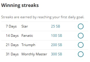 Swagbucks has a Daily Goal system with two earning targets each day. Hitting your first (and optionally second) goal gives bonus SB, and maintaining a daily streak across a full month earns you monthly streak bonuses (paid at the end or the first week of the next month, exact timing varies).