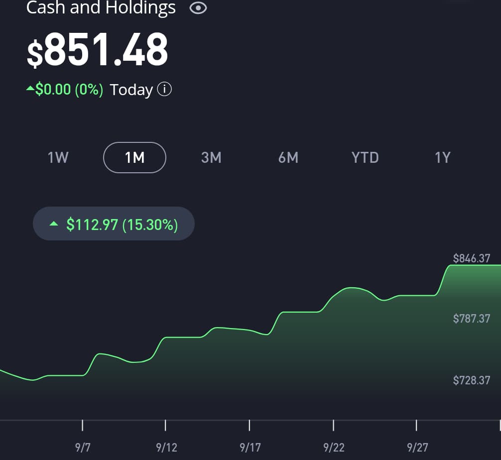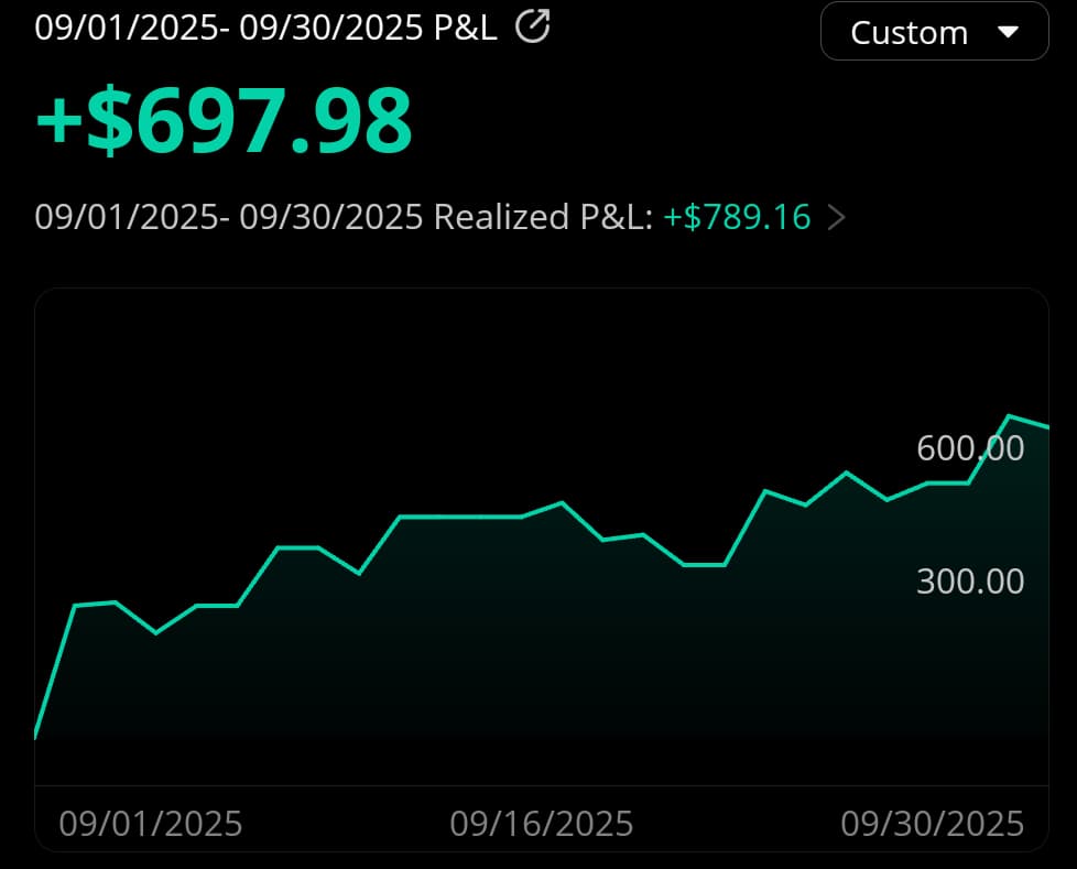I’m a few days late posting this, and since Robinhood doesn’t allow custom date ranges for tracking progress, the screenshot isn’t 100% accurate. I actually lost about $20 in the first few days of October 😅. For September, though, I was up $104.88, which is over four times my monthly goal. That’s a solid boost, the more money in the account, the easier it gets to grow, which should make the challenge smoother over time.