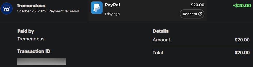 I’ve only used PayPal, goes through the Tremendous system and pays within minutes.