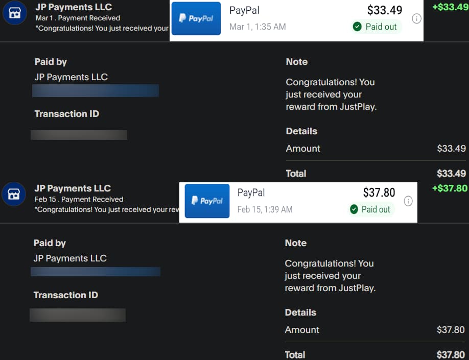 Justplay Payment Proof Screenshot